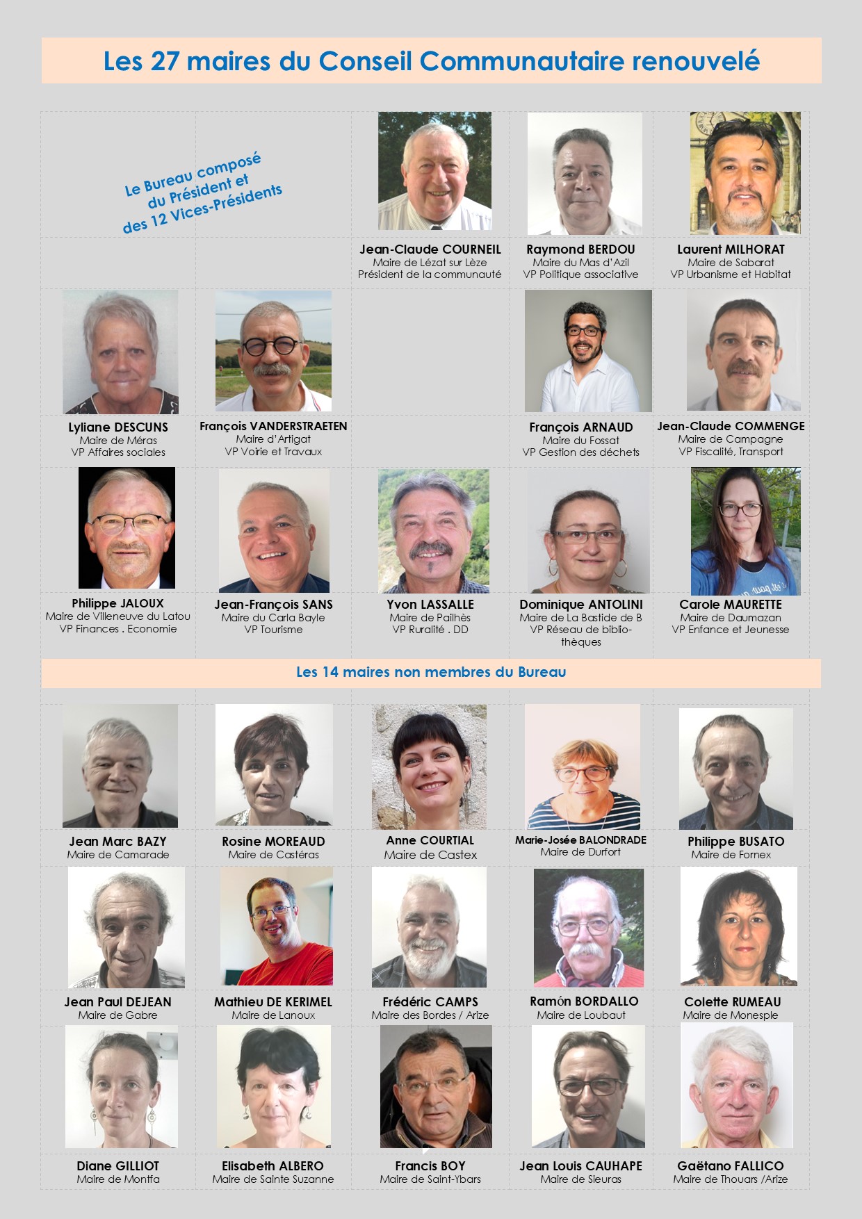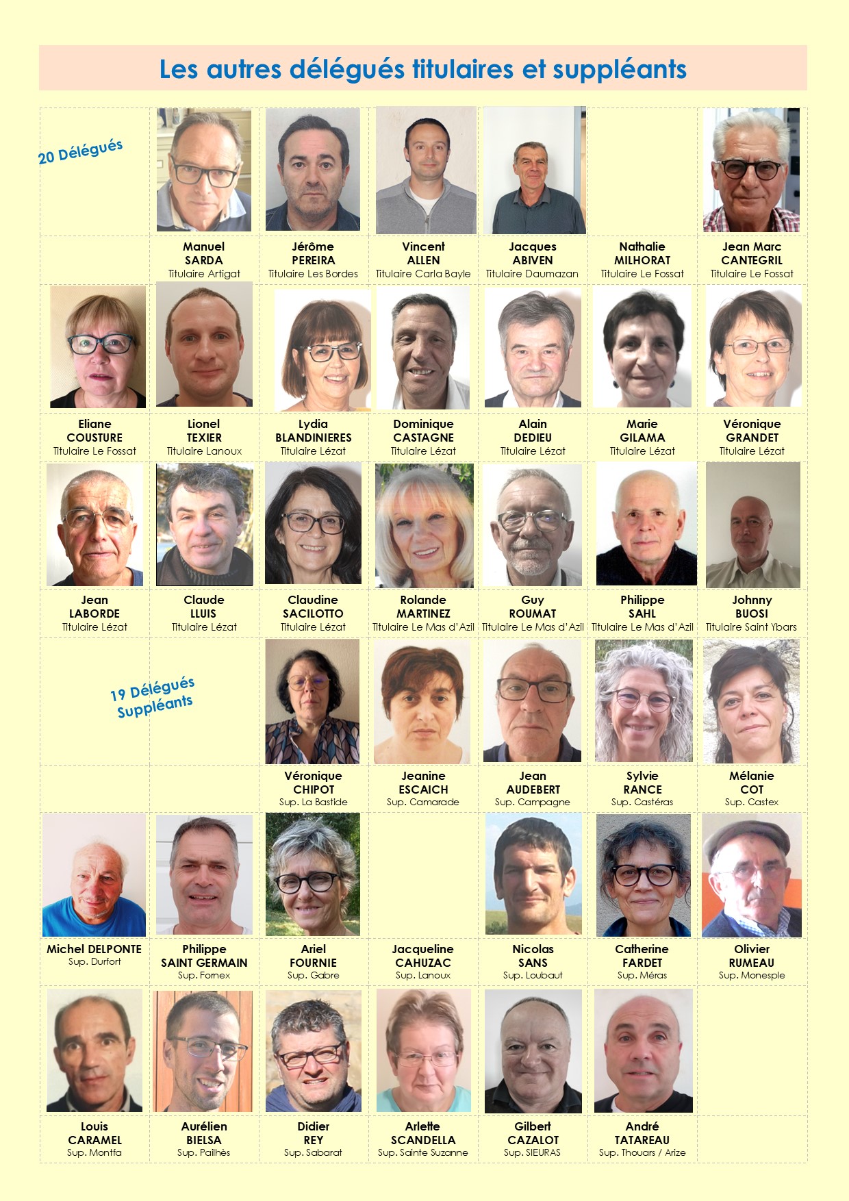 LEZAT SUR LEZE : Jean-Claude COURNEIL (LE MAIRE) - LES DELEGUES : Véronique GRANDET, Claude LLUIS, Lydia BLANDINIERES, Jean LABORDE, Claudine SACILOTTO, Alain DEDIEU, Marie GILAMA, Dominique CASTAGNE
