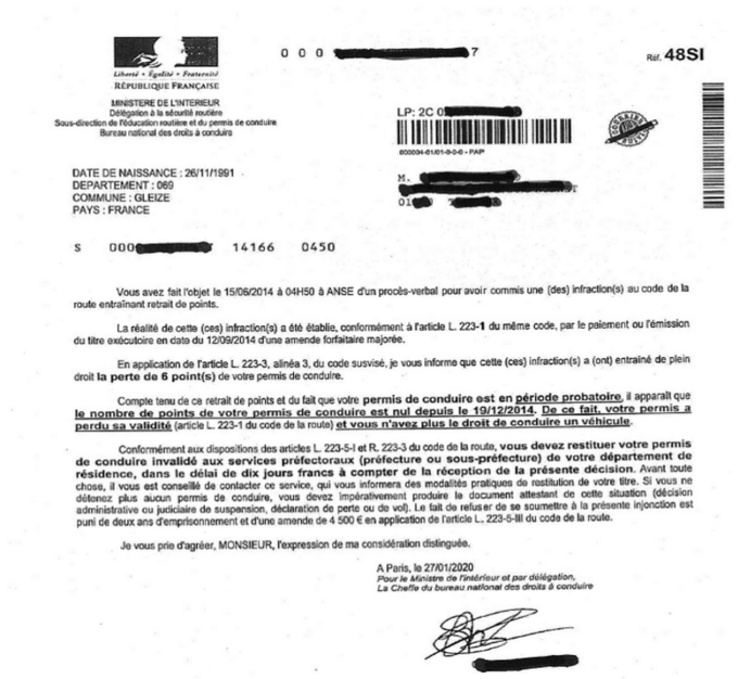 Si vous avez un permis probatoire et commettez une infraction entraînant le retrait d'au moins 3 points, vous en êtes informé par lettre recommandée (48N) avec AR .